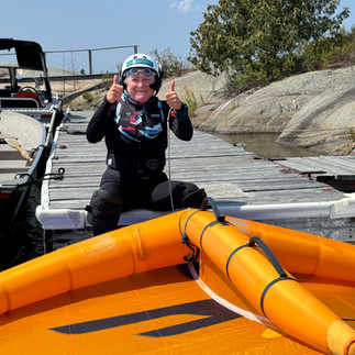 We took a break, had some burgers and then decided to continue the lesson on land for a bit. This was followed by winging on big windsurf boards which they quickly identified were much better than the small boards they’ve seen of people trying to learn winging on. Betsy at 73 (about to be 74 in two weeks!) was unbelievably amazing being able to position her board in the water and climb on it. Then she raised the wing and she managed to taxi on her knees back-and-forth, staying up upwind. Elise and Jamie both needed some tows upwind, but we’re steadily getting a good feel for handling their wings.