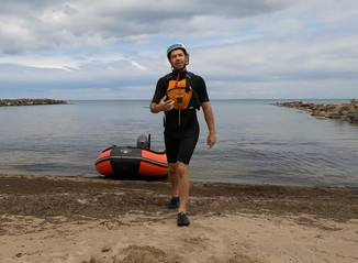 Luckily his parents have a great place right on the water. When I arrived at noon Adam was already in his shorty wetsuit eager to go! We decided against launching the Seadoo in Thornbury and rather try foiling behind their zodiac with 9.9hp motor. But first, a bit of on land foil training. I had Adam try my foil training board which he enjoyed. (His brother-in-law also wanted a try!) The on land simulator really helps to cement the concept that it is just your hips moving for and aft a little bit that moves the nose of the board down and up. We did the waiver paperwork and chatted with his family. Lastly we created a tow handle out of some floating rope and Adam's gym handle.