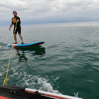 We took the foilboard out to the beach and launched the zodiac. I had the Fanatic Stingray 140 with the 99cm Slingshot foil underneath which is my favoured beginner equipment. I tried the setup first and we made a few adjustments to the boat and confirmed it worked. Now it was Adam's turn. I started slowly and he stayed out to the side of the wake in the flat water. Soon enough, he was up on the foil. Amazingly his very first run was around a minute long. Eventually he got up pretty high but didn't even overfoil. He just freaked out about how high he was and headed back down eventually pearling the nose of the board.