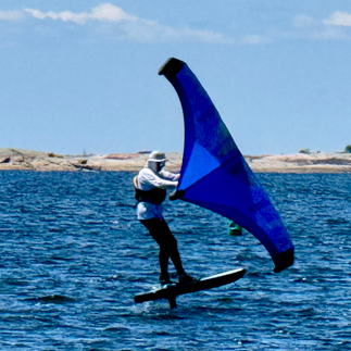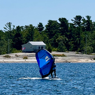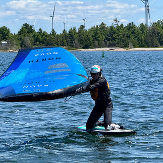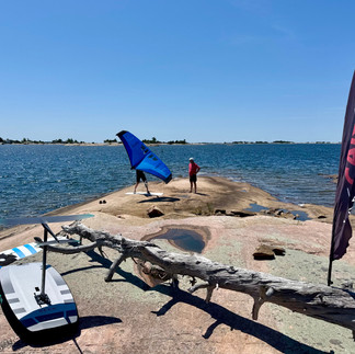 Down at the point the flags were flying in the stiffening breeze and we got ready for our session. I went through the full demo on the WeCANfoil gear using my foam “board” on the rocks. Grateful to WeCANfoil for the 5m North wing and 6”4’ North Seek Prime board with 2100 sonar foil. We then moved to the rotating simulator board where the guys got an even better sense of steering the board while in taxi position. They also learned how power up the wing when standing on something very wobbly.
