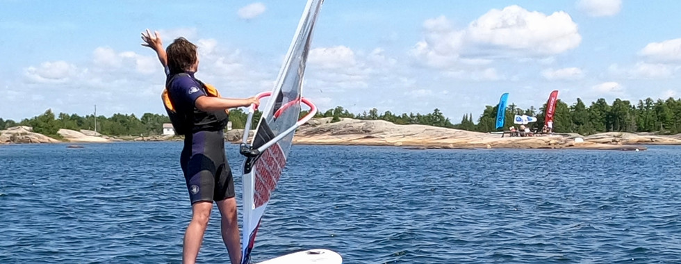 We started with the land simulator and this was the first time to try out my new foam foot position markers on the board. Yellow first and then green for going! Dana was first with the 3.2 Duotone Now sail. After getting up, steering, getting underway and tacking, Dana was ready to hit the water. As he had some windsurf experience (Aruba 15 years ago?), I put him on the smaller Fanatic Viper 80 board. Dana sailed off from the point confidently and proceeded to get cheers from the crowd as he completed his first tack. Then he was off windsurfing back and forth, not even fazed by the large sailboat coming out of the harbour.